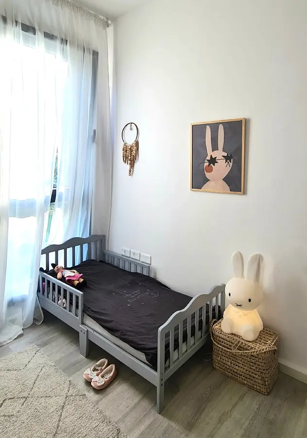 הזוג שמחלק את עבודתו בין המשרד לבית קיבל חדר עבודה נעים ומזמין. חדר ההורים מפנק, חדר ילדים, חדר משחקים, סלון ופינת אוכל עם נגיעות עיצוב נורדיות עם אקלקטיות חמימה.