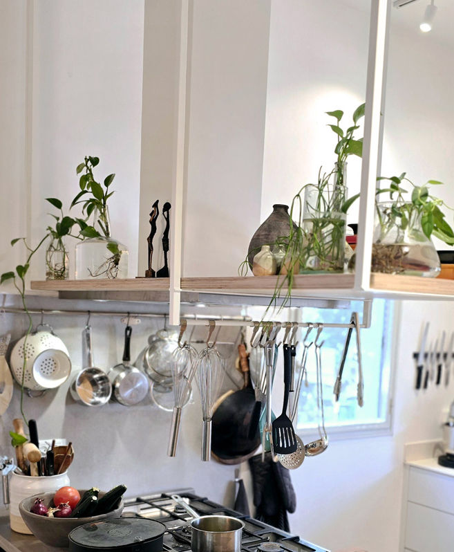 סביב קולט האדים הוספנו אלמנט מרחף של ברזל ועץ המשמשים עוד מקום אחסון ותלייה.